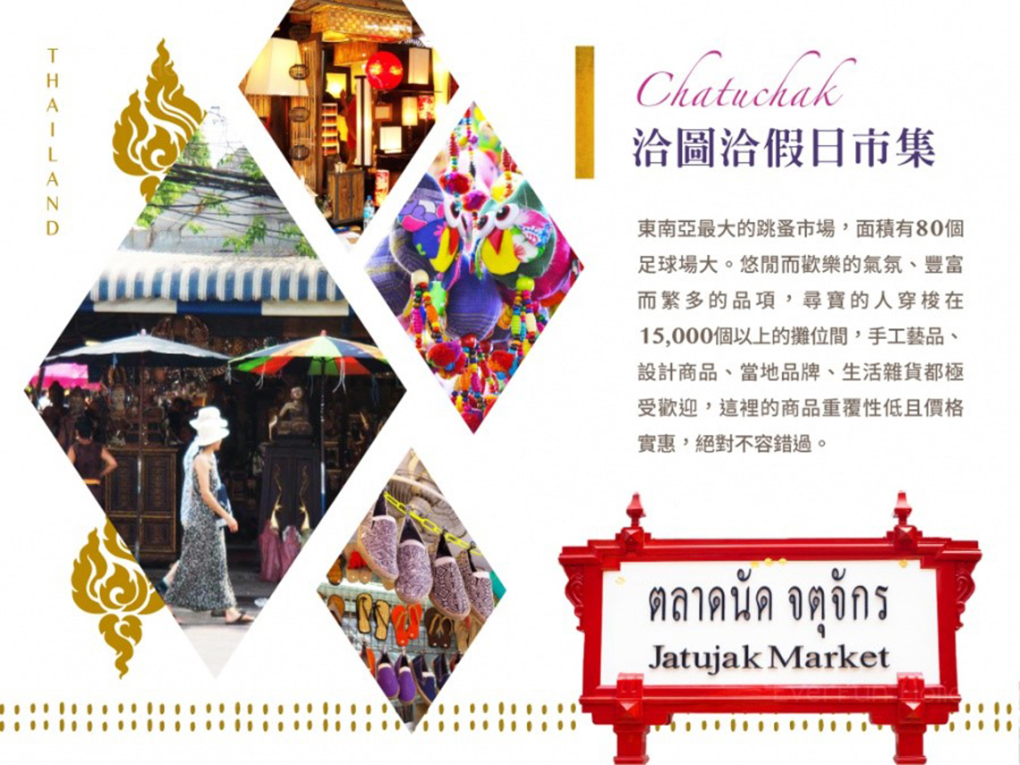 【洽圖恰週末市集】總面積約14公頃的加都加週末市場,是東南亞最大的週末市場,也是曼谷最熱門的觀光購物區。每個週末,這裡都湧進大批採購人潮,連本地人都大包小包地買不完。洽圖洽設有 15000個攤位,每天約有200,000位客人光顧。在市場深處時,你會忘了現在還是白天。你可以在這兒買到任何商品。離開時,每個人都錢包空空,精疲力竭,滿載而歸。半開放式的市場內部巷道縱橫,直走、拐彎、再回頭,又是不同的店家商區,遊逛起來別有趣味。市場大,商品種類也多,服飾、手工藝品、陶瓷器皿、傢俱擺設、古董、書籍以及二手服飾等都有,甚至還有園藝盆栽與寵物用品。逛累了,在商店之間還可找到小吃店。