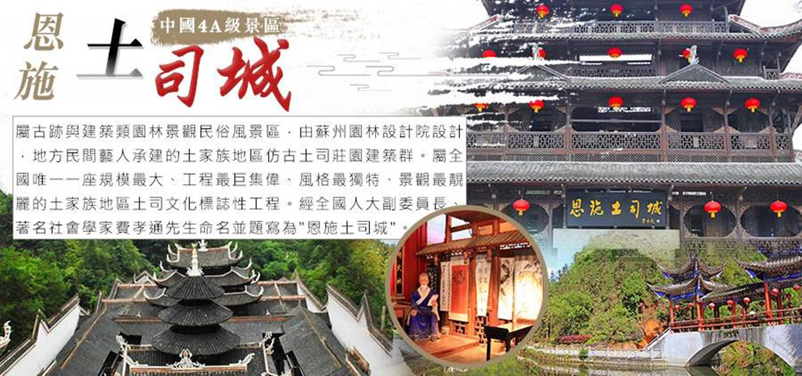 【恩施土司城】占地面積300餘畝,主要分民族文化展示區、宗教展示區、休閒娛樂區三個主要區。這裏建有我州土家族、苗族、侗族三個主要少數民族的傳統建築,以展示各具特色的建築、雕刻藝術。它是目前中國保存最完整的土家土司王城,是土家文化的重要標誌,有“中華土家第一城”的美譽。土司城由墨沖樓、素素卡斜車、土司王府、土司簡介碑、撈此羅又、爽心園、鐘鼓樓等景點構成。雖歷經滄桑,飽經風雨,整個土司王城依然氣勢恢宏,極具土家特色和藝術價值。