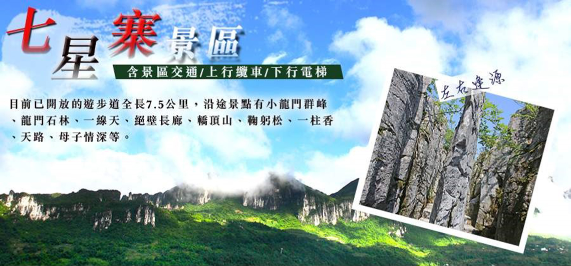 【七星寨絕壁】七星寨絕壁為三疊系灰岩中發育的巨型柱狀岩體群,兀然直立於陡坡上,高聳林、,極為壯觀。它不同于峰林及石林,而是一種柱狀山體,故稱“岩柱林”。 正對的“岩柱”實際上是巨型岩柱塊,長800米、寬150米、柱高近200米,頂部是兩頭高、中間低的弧形平面,這是因為頂面中央有個匯水小水塘、形成了表層窪地。