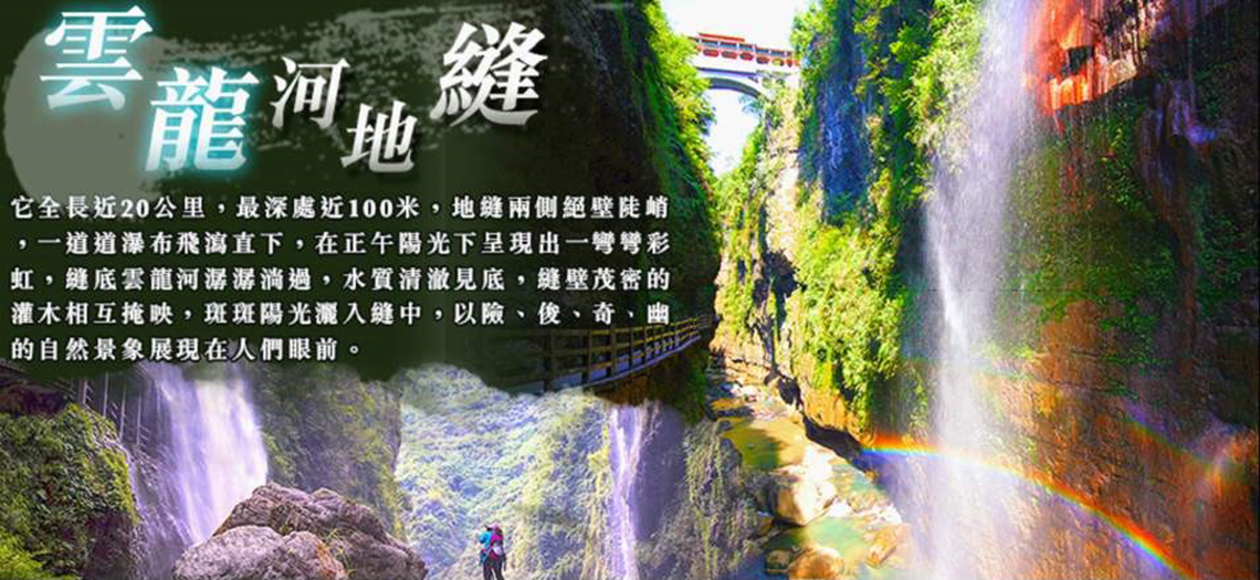 雲龍地縫呈“U”型,上下垂直一致,全長3600米,平均深75米,是奇異獨特的喀斯特景觀。雲龍地縫囊括了眾多旅遊資源單體,外部絕壁巨壑環抱,山巒疊障,地形多變;地縫內流水淙淙,飛瀑跌落,五彩黃龍瀑布、彩虹瀑布、雲龍瀑布、冰瀑、沐撫飛瀑都是觀景的好去處。