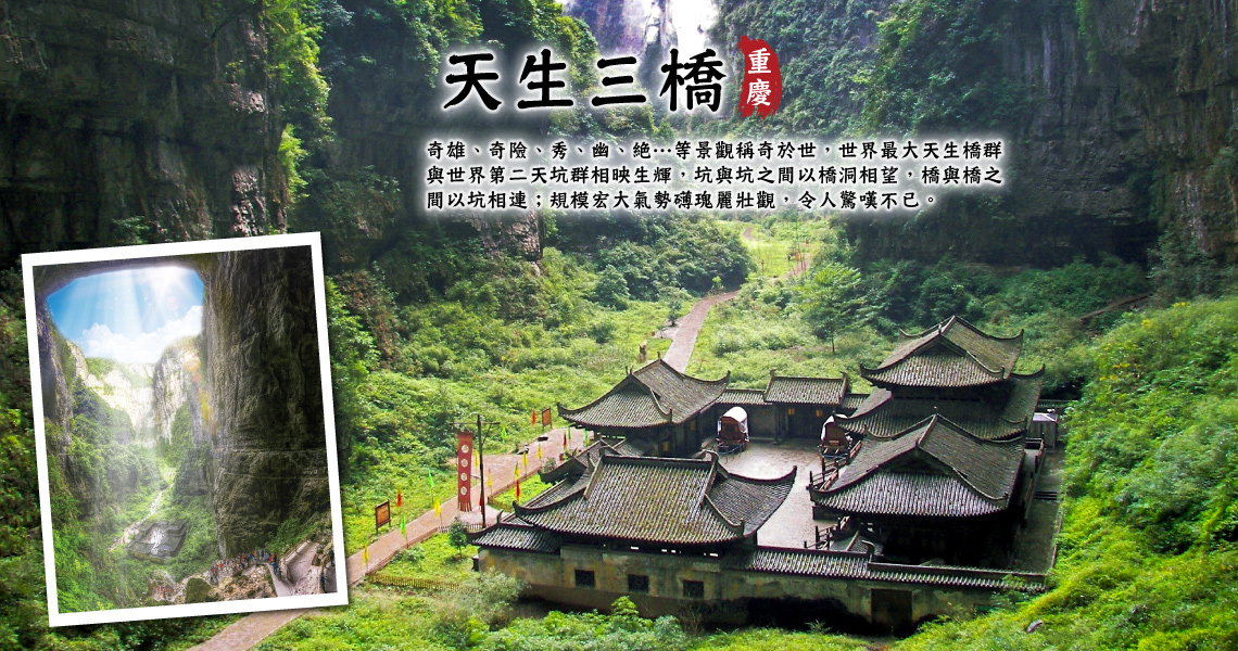 【天生三橋+電瓶車】是世界上最大的天生橋群,以天龍橋、青龍橋、黑龍橋天生三座規模龐大, 氣熱磅礡的石拱橋稱奇於世,三橋平均高 200 米以上,橋面寬約 100 米,在距離僅 1.2 公里的範圍內就有如此龐大的三座天生橋實屬國內罕見。景區林森木秀、峰青嶺翠、懸崖萬丈、壁立千仞、綠草成茵,修竹搖曳、飛泉流水,一派雄奇、蒼勁、神秘、靜幽的原始自然風貌,以山、水、瀑、峽、橋共同構成一幅完美的自然山水畫卷使人留連忘返。大自然的鬼斧神工造就了這 3 座天生的石拱橋,使其具有雄、奇、險、秀、幽、絕等眾多特點,雖歷經千萬年的風風雨雨,至今卻依然如故。清晨時分, 霧氣彌漫,高大的三橋猶如連通天界神宮之間的禦橋,更顯縹緲、震撼。美不勝收的絕佳天然景觀是大自然的神奇造化而賜給人類的瑰寶,他毫無懸念的被 13 屆世界遺產大會全票通過足以證明那獨特魅力所在。張藝謀在此拍攝「滿城盡帶黃金甲」而名揚天下。