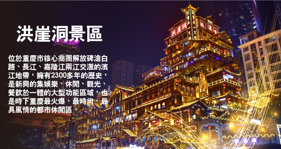 【洪崖洞古建築群】位於重慶市核心商圈解放碑滄白路、長江、嘉陵江兩江交匯的濱江地帶,是新興的集娛 樂、休閑、觀光、餐飲於一體的大型功能區域,也是時下重慶最火爆、最時尚、最具風情的都市休閑區。在嘉陵江索道南站的正下方至嘉濱路段,這片極富巴渝文化特色又極為搶眼的建築群落——洪崖洞民俗風貌區。 該風貌區建在百丈懸崖峭壁之上,讓解放碑直達江濱。既雄偉而又新奇,既古典而又現代。按照“世界獨有, 重慶一絕”的理念,風貌區成功復制了“懸崖上的吊腳樓,記憶中的老重慶”。