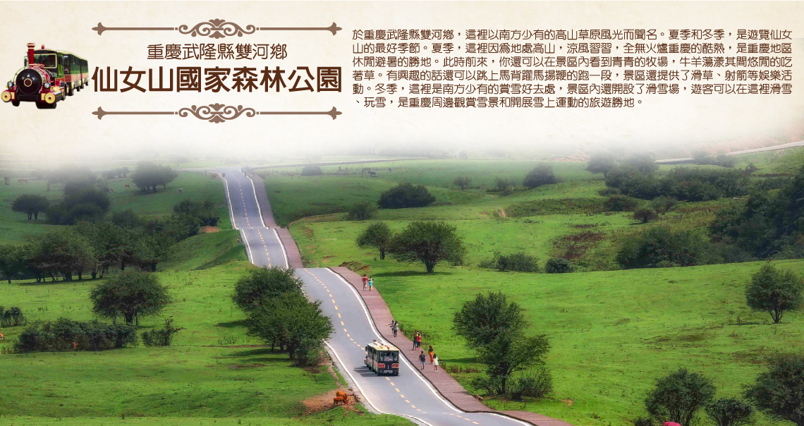 【仙女山+小火車】位於重慶市武隆區烏江北岸,屬武陵山系, 因其山有一峰酷似翩躚起舞的仙女而得名,占地面積100 平方公里, 海拔 1650—2033 米,年平均氣溫低於 11.2℃,公園擁有草場、森林、濕地、湖泊等旅遊資源,是重慶周邊最大的高山草原。氣候宜人, 風光獨好。是絕妙的踏青、消夏、品秋、賞雪之休閒度假勝地,素有“南國牧原”、“山城夏宮”、“東方瑞士”和“落在凡間的伊甸園” 之美譽。林海、奇峰、草場、雪原為仙女山“四絕”。山上星級飯店、 別墅群、蒙古包等住宿設施齊全。設有騎馬、滑雪、滑草、賽車、彩彈射擊、悠波球、滑翔傘、篝火、燒烤等 20 餘個遊樂項目,深受旅遊者喜愛,其風光獨特、功能配套與國際一流景區媲美,身臨其間成為您心靈安頓的停泊之處。