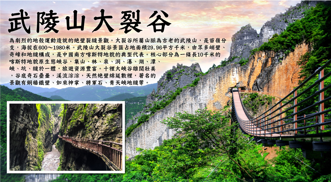 【武陵山大裂谷】位於重慶市涪陵區城東南約 40 千米的武陵鄉境內,武陵山系西北尾端, 烏江下游東岸。為劇烈的地谷運動造就的絕壁裂縫景觀。大裂谷所屬山脈為古老的武陵山,是苗嶺分支,海拔在 600~1980 米。武陵山大裂谷景區占地面積 29.96 平方千米,由眾多峭壁、奇峰和地縫構成,是中國南方喀斯特地貌的典型代表。核心部分為一條長 10 千米的喀斯特地貌原生態峽谷,集山、林、泉、洞、瀑、湖、潭、峽、坑、縫於一體,旅遊資源豐富。十裡大峽穀雄闊壯美,谷底奇石疊壘,溪流淙淙,天然絕壁綿延數 裡,著名的景觀有銅牆鐵壁、如來神掌、將軍石、青天峽地縫等。