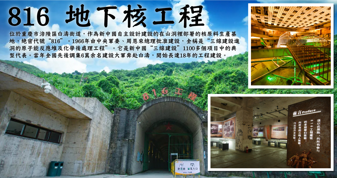 【816地下核工程】位於重慶市涪陵區白濤街道,緊鄰烏江背靠武陵山。1966年由中央軍委、周恩來總理批准建設,該工程打山洞用時8年,安裝設備用時9年,總投資7.46億元人民幣。先後投入 6 萬多人參與建設, 816 工程遺址軸向疊加全長 20 余千米,完全隱藏在山體內部,洞內冬暖夏涼,四季恒溫。總建築面積 10.4 萬平方米,主洞室高達 79.6 米,拱頂跨高 31.2 米,洞內有大型洞室 18 個,道路、導洞、支洞、隧道及豎井 130 多條,建築佈局宛如迷宮,洞中有洞,洞中有樓,樓中有洞。