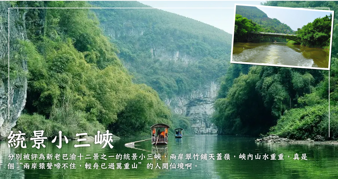 【統景小三峽】統景有溫塘、桶井、老鷹三個峽谷,素有小山峽之美稱,因其“桶井峽猿”而得名,被評為“巴渝十二景”之一。在方圓 11 平方公里的景區內容山、水、林、泉、洞、峽、小島、古寨於一體,泉奇洞異,山秀峽幽,有“武陵仙境”之稱。統景峽谷位於長江支流禦臨河的溫塘河段,由溫塘峽、統景峽、老鷹峽3 個峽谷組成。整段峽谷像精緻秀雅的山水盆景,融合青山、綠水、森林、溫泉、峽谷、瀑布、天池、小島、古寨等自然景觀和人文景觀,所以被稱為“自然博物館”,2008 年,“統景溫塘”景色被評為“巴渝新十二景”之一。