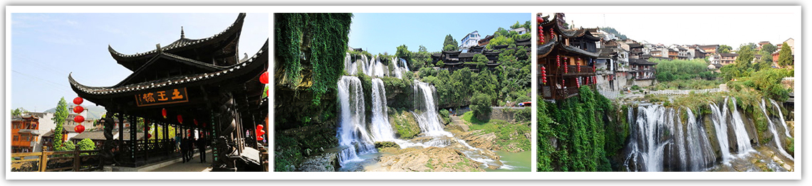 王村瀑布】芙蓉镇三面环水,瀑布穿镇而过,别有洞天。这是湘西最大最壯觀的一道瀑布,高60米,寬40米分兩級從懸崖上傾洩而下,聲勢浩大,方圆十里都可聽見。