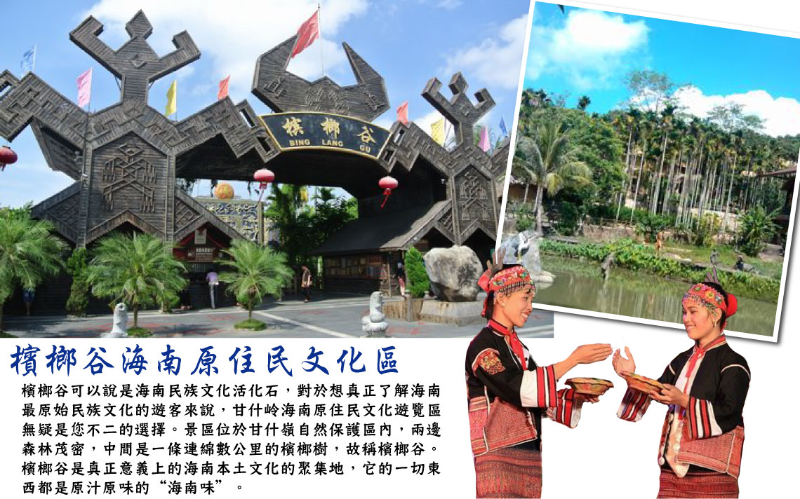 【檳榔谷海南原住民文化區】是海南民族文化活化石,對於想真正了解海南最原始民族文化的遊客来說,甘什岭海南原住民文化遊览區無疑是您不二的選擇。景區位於甘什嶺自然保護區内,两邊森林茂密,中間是一條連綿數公里的檳榔樹,故稱檳榔谷。檳榔谷是真正意義上的海南本土文化的聚集地,它的一切东西都是原汁原味的“海南味”。本土居民最大的特徵是“雕題離耳”。所谓的“雕題”就是纹脸,即在脸上刻圖案;“離耳”就是耳朵上佩戴大的耳環。在檳榔谷,具備這些基本特徵的海南人處處可見,成為一道珍貴的人文風情景觀。純樸的黎族是海南的土著民族,這裡當然保存着最原始、最純樸的黎族風情。