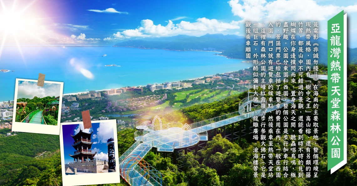 【亞龍灣熱帶天堂森林公園】是電影《非誠勿擾∥》在海南的主要取景地,整個環境呈現熱帶風格,園內有「樹中之王」高山榕、還有另類的籐竹等,都是山中不可錯過的景觀,還能看到時不時的見到蝴蝶在你身邊撲閃而來,置身海天之間,聽蟲唱鳥鳴,極盡野趣。公園分東園和西園,整個公園是步行加車行結合的,景區門票已經包括了遊覽車的費用在內。一般在西園入園,門口就有遊覽車的候車點,然後乘車至熱帶天堂站,這裡有森林公園的主峰紅霞嶺,步行參觀大佛石(它是一組巨石,外形酷似彌勒大佛)、龍雕廣場、滄海樓等景觀後乘車離園。