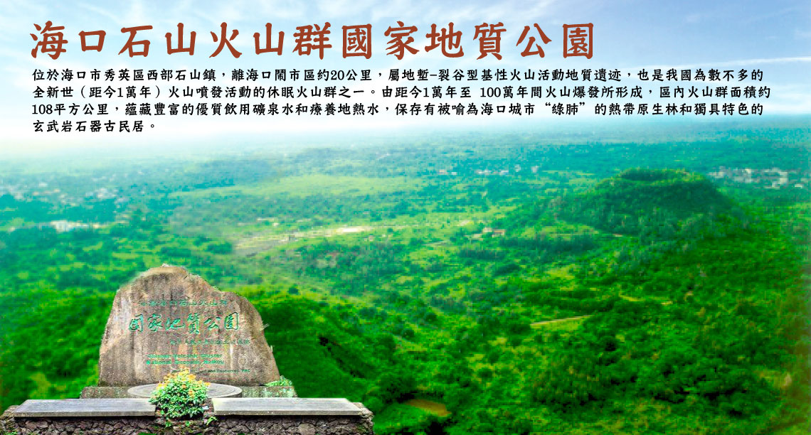 【海口石山火山群國家地質公園】位於海口市秀英區西部石山鎮,離海口鬧市區約20公里,屬地塹-裂谷型基性火山活動地質遺迹,也是我國為數不多的全新世(距今1萬年)火山噴發活動的休眠火山群之一。由距今1萬年至 100萬年間火山爆發所形成,區內火山群面積約108平方公里,蘊藏豐富的優質飲用礦泉水和療養地熱水,保存有被喻為海口城市“綠肺”的熱帶原生林和獨具特色的玄武岩石器古民居。