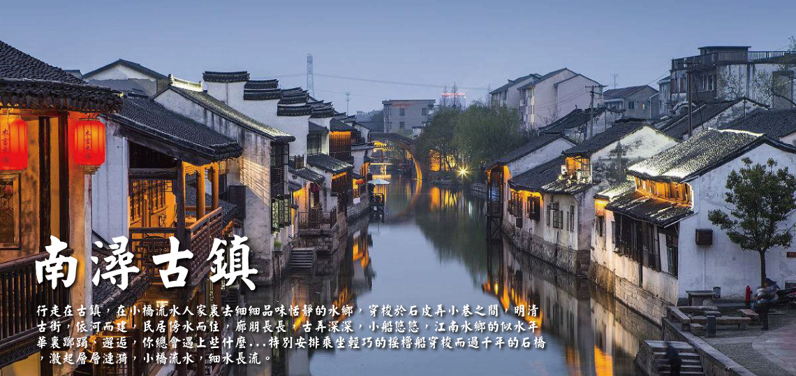 【進出古鎮乘擺渡搖櫓船】是中國江南的封面。在江南水鄉,有不少像烏鎮歷史這樣的古鎮,美麗寧靜的像一顆顆珍珠。烏鎮除了擁有大家都具備的小橋流水人家的水鄉風情和精巧雅緻的民居建築之外,更多的是飄逸著一般濃郁的歷史和文化氣息。這可能是她的歷史最為悠久、文化最為發達的緣故。西柵的魅力跟夜景,夜宿烏鎮讓您更能輕鬆漫步於這優美的古鎮。烏鎮大劇院於2013年5月建成,是首屆烏鎮戲劇節的主場館,俯視宛如一朵盛開於湖面的並蒂蓮,優美獨特的造型,外牆以古法京磚及老船木冰裂紋窗紋裝飾,被譽為“中國最美的劇場”。