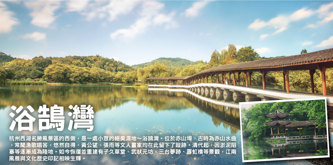 【西湖秘境~浴鵠灣】位於「西湖三堤」的楊公堤西面,是一座園林式景區,浴鵠灣也有悠久歷史,始建於宋代,現存武狀元坊、子久草堂、霽虹橋、先賢堂等古跡,可謂集山水風光與中國文化景觀於一體。浴鵠灣最著名的霽虹橋,是一座典型江南水鄉風格的石拱橋,白牆黑瓦,木石相間,與園內各景觀隔水相望,成為遊客拍照打卡的必去之選。元代著名畫家、《富春山居圖》的作者黃公望,曾在此結廬隱居,他所居住的地方,就是浴鵠灣的標誌性景點之一,子久草堂,設有黃公望故居陳列室。