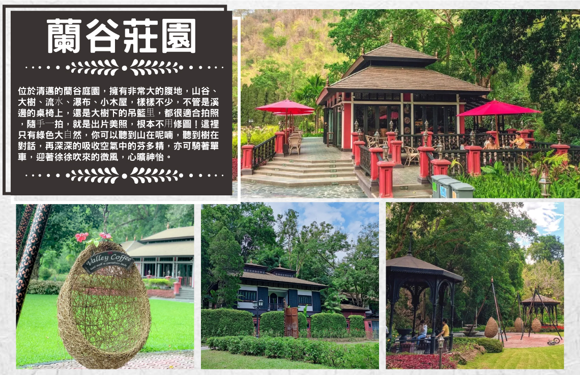 位於清邁的蘭谷庭園,擁有非常大的腹地,山谷、大樹、流⽔、瀑布、小木屋,樣樣不少,不管是溪邊的桌椅上,還是大樹下的吊籃⾥,都很適合拍照,隨⼿⼀拍,就是出片美照,根本不⽤修圖!這裡只有綠色大⾃然,你可以聽到山在呢喃,聽到樹在對話,再深深的吸收空氣中的芬多精,亦可騎著單車,迎著徐徐吹來的微風,心曠神怡。