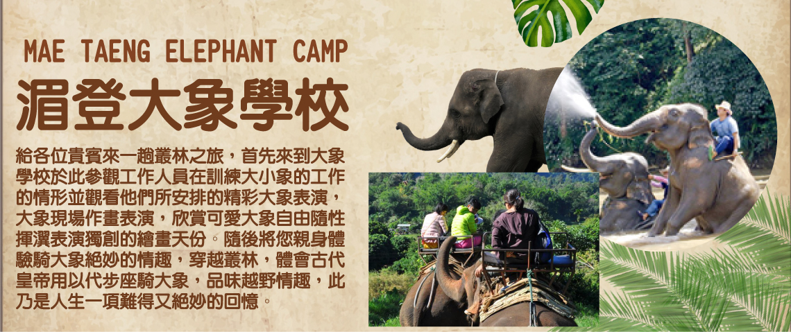 給各位貴賓來一趟叢林之旅,首先來到大象學校於此參觀工作人員在訓練大小象的工作的情形並觀看他們所安排的精彩大象表演,大象現場作畫表演,欣賞可愛大象自由隨性揮瀷表演獨創的繪畫天份。隨後將您親身體驗騎大象絕妙的情趣,穿越叢林,體會古代皇帝用以代步座騎大象,品味越野情趣,此乃是人生一項難得又絕妙的回憶。
