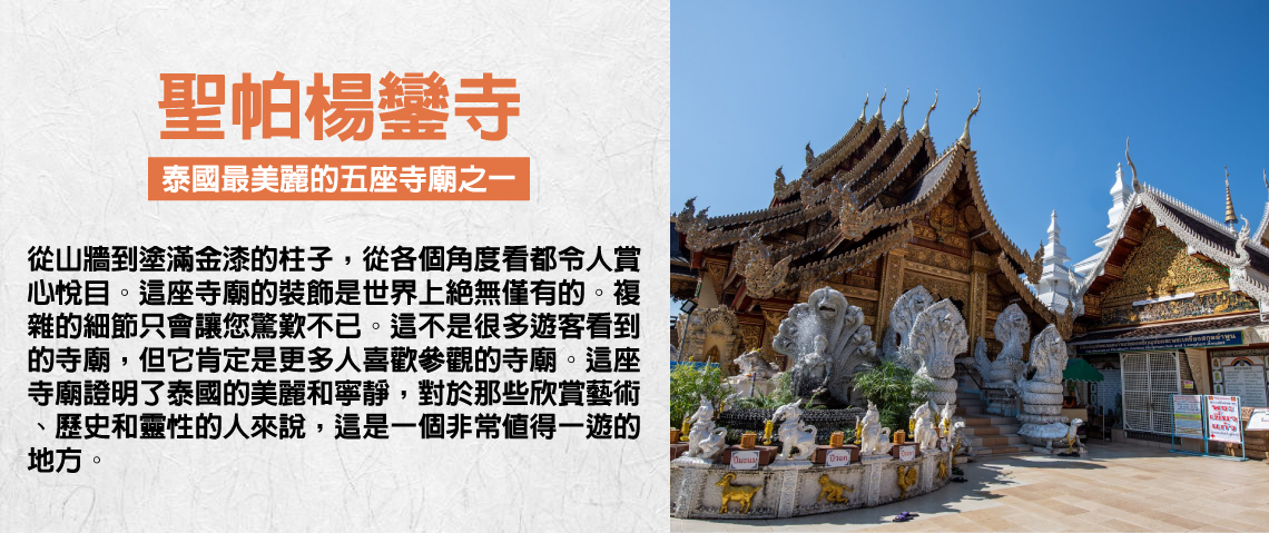 聖帕揚隆寺是泰國最美麗的五座寺廟之一;該寺廟以前被稱為康南蓬寺,建於 531 年。Prakong Hall 建於 2005 年,是供奉從湄公河運來的翡翠佛像的場所。翡翠佛像的全名是 Phra Putta Anyarat Maha Mati Sri Hariphunchai。該寺廟以其美麗的灰泥而聞名,尤其是 Prakong Hall,從山牆到塗滿金漆的柱子,從各個角度看都令人賞心悅目。這座寺廟的裝飾是世界上絕無僅有的。複雜的細節只會讓您驚歎不已。這不是很多遊客看到的寺廟,但它肯定是更多人喜歡參觀的寺廟。這座寺廟證明了泰國的美麗和寧靜,對於那些欣賞藝術、歷史和靈性的人來說,這是一個非常值得一遊的地方。